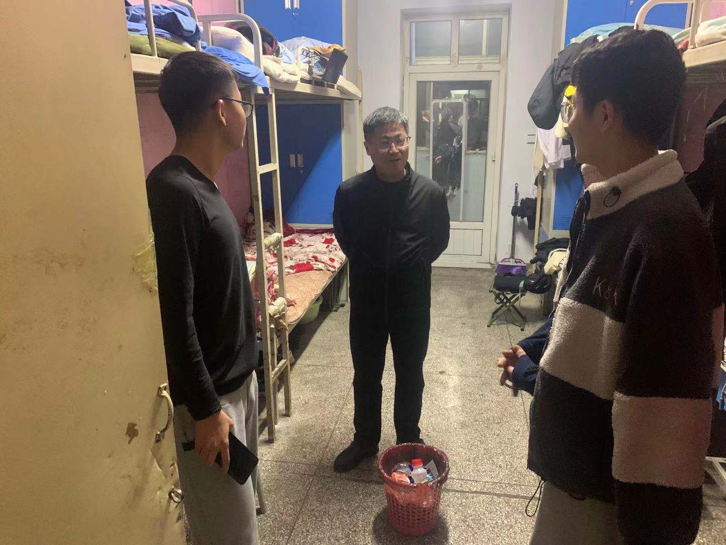 周勇来到D02号楼606、608、617、618、631、632、634、635、636宿舍,同在宿舍的同学一一握手,并从不同方面和角度和同学们进行交流,询问同学们在生活和学习上的困难和需求,回答了学生当前关注的问题,并提醒同学们相关注意事项,尤其是要提高警惕、防止电信诈骗等情况发生,发现不安全、不稳定因素要及时反馈给辅导员老师。院领导的关怀让同学们在寒风的初冬里感受丝丝暖意。