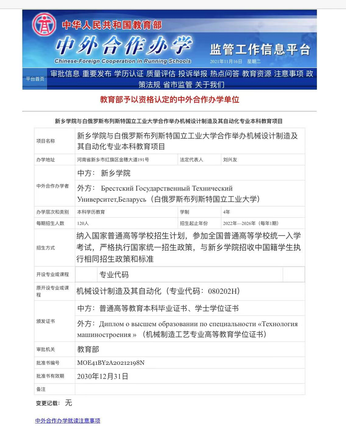 近日,教育部发布了《关于批准2021年上半年中外合作办学项目的通知》(教外函[2021]35号),我校与白俄罗斯布列斯特国立工业大学合作举办机械设计制造及其自动化专业本科教育项目成功获批(批准书编号:MOE41BY2A20212198N)。该项目是我校继中美生物技术专业本科教育项目后,获批的第二个中外合作办学本科教育项目。该项目学制四年,纳入国家普通高等教育招生计划,将于2022年招生,计划招收120人。项目采用“4+0”双学位培养模式,学生无需出国,完成双方共同制定的人才培养方案及论文答辩,可获得白俄罗斯布列斯特国立工业大学机械制造工艺专业高等教育学位证书。项目申报期间,在学校领导指导及相关部门协助下,william威廉中文克服水灾、疫情期间带来的困难,项目一次申报获教育部批准,高质量完成了项目申报工作。