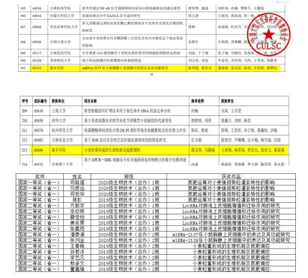 其中,参赛作品“氮肥运筹对小麦强弱势粒灌浆特性的影响”荣获2022年全国大学生生命科学竞赛国家一等奖,由我院19级和20级生物技术(合作)专业学生以及生命科学与基础医学学院学生合作完成,充分展现了学校合作办学专业培养下学生优秀的专业素养。