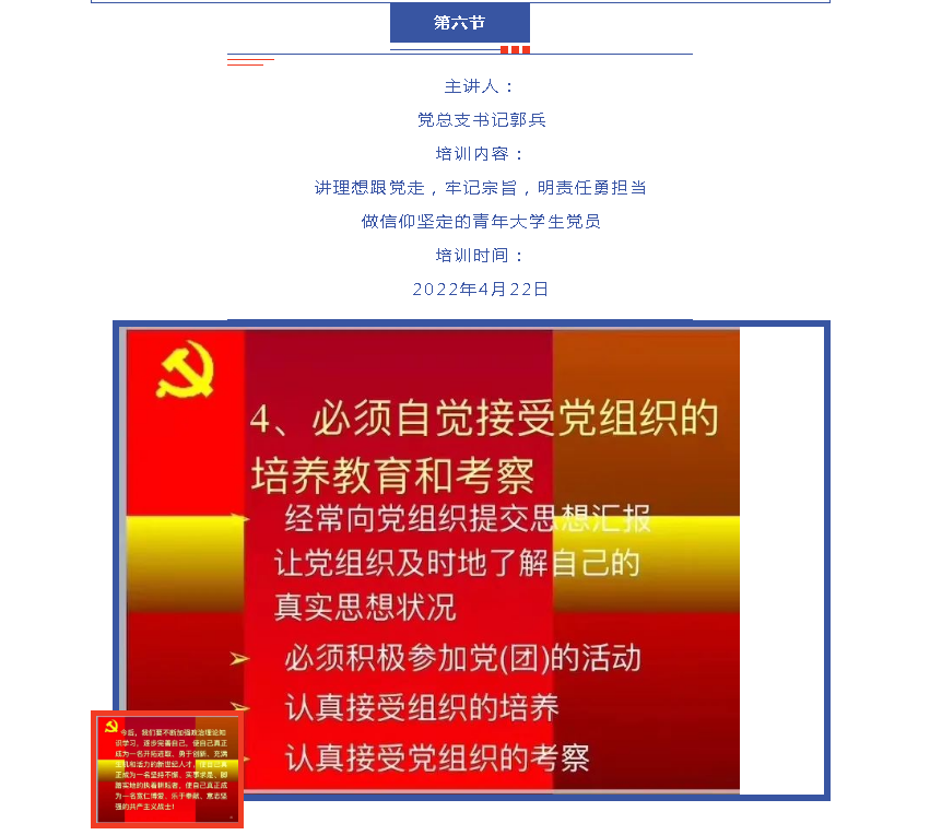 此次党课培训分别邀请辅导员陈楠老师,辅导员陈博老师,副教授敖翔老师,分团委书记闫琰老师,党支部副书记阎驰骋老师,党总支书记郭兵老师担任主讲,系统的讲授了知识,引导学生端正入党动机。通过此次培训,同学们进一步加深了对共产党先进性和科学性的认识,坚定了理想信念,明确了奋斗目标。